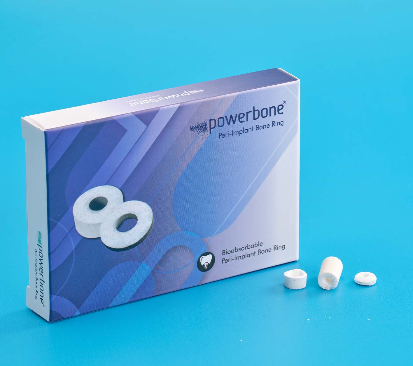 Powerbone Peri-Implant Ring is a flexible, synthetic ring-shaped graft for peri-implant bone defects, composed of silicate-enriched β-TCP in a PLA polymer lattice.